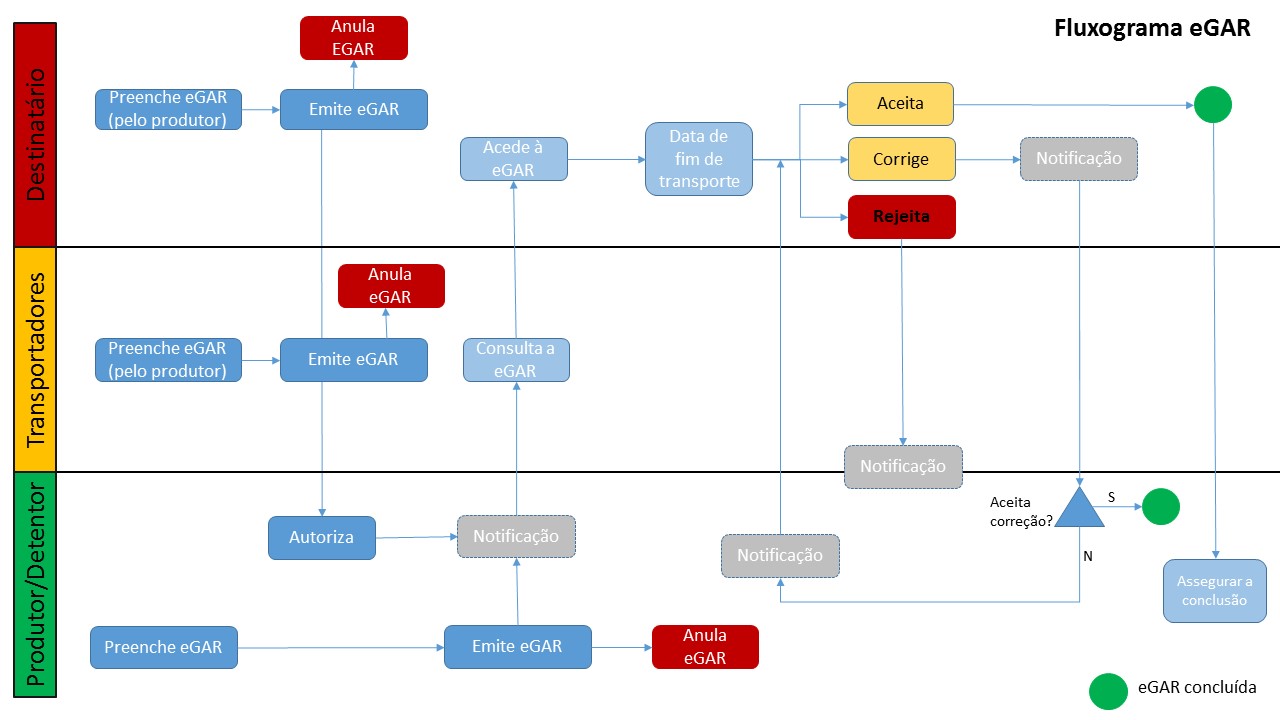 Uma e-Gar durante o seu período de vida, transita entre diversos intervenientes, estados e operações. O fluxograma demonstra uma visão geral do processo.